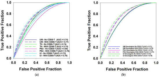 The performance of observers from the different specialties without CDSS-T did differ. In this study, on average, oncologists had a larger gain in AUC than radiologists with the CDSS-T aid, suggesting that CDSS-T could be a potentially useful tool for non-radiology physicians. There was some difference in the improvement of observers from different institutions.