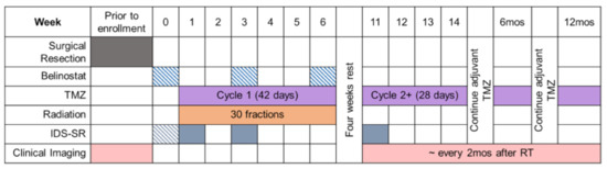 One-year timeline of chemotherapy, intravenous belinostat, and radiation for patients in NCT02137759.