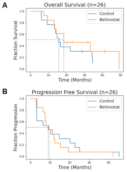 (A) Overall Survival (OS) Kaplan-Meier Survival Curves. The median OS for the control and belinostat cohorts was 15.8 and 18.5 months, respectively (p = 0.53), for all patients. (B) Progression free survival (PFS) for all patients. The median PFS for control and belinostat cohorts was 9.0 months and 9.3 months, respectively (p = 0.75).