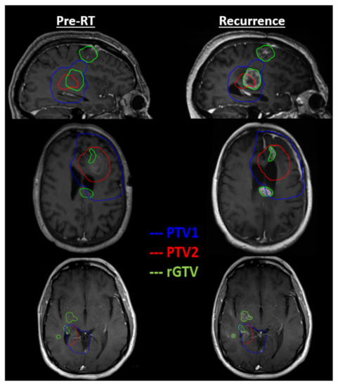 - McDonald, M.W.; Shu, H.-K.G.; Curran Jr, W.J.; Crocker, I.R. Pattern of failure after limited margin radiotherapy and temozolomide for glioblastoma. Int. J. Radiat. Oncol. Biol. Phys. 2011, 79, 130–136. [Google Scholar] [CrossRef]