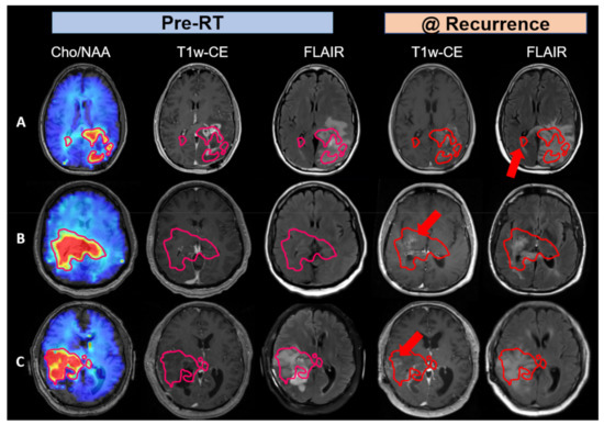 Pre-RT sMRI scans suggest out-of-field recurrence in the belinostat cohort with tumor infiltration beyond what is shown in standard imaging (indicated by red arrows). (A) This patient had two-fold Cho/NAA elevation that had spread contralaterally. While pre-RT standard imaging failed to detect this, FLAIR hyperintensity at recurrence mimics the direction of tumor infiltration detected by pre-RT sMRI. (B) The second patient had tumor infiltration across the midline that wasn’t detected by pre-RT standard imaging. Lesions at recurrence in both T1w-CE and FLAIR MRIs confirm Cho/NAA abnormalities in the pre-RT sMRI scan, suggesting standard imaging underestimated the extent of tumor infiltration. (C) This patient had a large lesion of metabolically active tumor that was not shown in T1w-CE, thus, undertreated, which became apparent at recurrence.