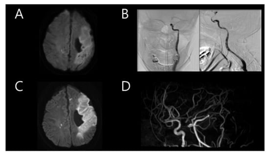 A 33-year-old woman was previously admitted with global aphasia at gestational week 7. She received daily injections of 2 cc of progesterone and low-molecular-weight heparin due to her history of two previous pregnancy losses at 25 and 28 weeks of gestation, respectively. These miscarriages each happened 2 and 3 years before the stroke, spontaneously after cervical ripening. Neurological examination revealed alert mental status, global aphasia, and right hemiparesis (Medical Research Council (MRC) grade, 3/3), indicating a National Institute of Health Stroke Scale (NIHSS) score of 11. Brain magnetic resonance imaging (MRI) revealed a stroke in the left middle cerebral artery (MCA) territory (Figure 1A). Intravenous tissue plasminogen activator (tPA) was administered, with an onset-to-door time of 1 h and 23 min. Intra-arterial thrombectomy was also subsequently performed. Transfemoral cerebral angiography (TFCA) revealed the total occlusion of the distal portion of the left internal carotid artery (ICA) with a massive thrombus. It was clearly a by-product of arterial dissection nearby; significantly, the operator felt the existence of the flap even before any further invasive procedure was practiced. However, the procedure could not be continued because of the severe headache experienced by the patient (Figure 1B). A brain MRI performed the following day revealed acute infarction in the left MCA territory with multifocal embolic infarction in the bilateral hemispheres and the complete occlusion of the left ICA (Figure 1C,D). Transthoracic echocardiography (TTE) used to verify the cardioembolic source revealed mild akinesia; however, the heart appeared normal on cardiac computed tomography (CT). The cardiac CT findings suggested acute pulmonary thromboembolism in the left lower lobe. Considering the massive thrombus in the left MCA and suspected pulmonary thromboembolism, warfarin was administered. Autoimmune disease screening tests, including those for anticardiolipin antibody and anti-beta-2 glycoprotein I antibody, were conducted twice, with negative results both times. Additionally, coagulopathy screening tests, including those for antithrombin antibody 87.7% (normal range 75–125), protein C antigen 111.8% (normal range 72–160), and protein S antigen 108.4% (normal range 60–150), were negative. The patient was discharged after her neurological symptoms improved (NIHSS score of 3).