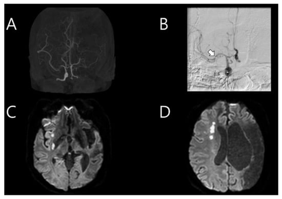 Five and a half years after the first stroke, the patient was re-admitted for sudden dysarthria. A neurological examination revealed alert mental status, mild dysarthria, left facial palsy, and left hemiparesis (MRC grade 4/4). Brain CT angiography indicated recent severe stenosis in the M1 portion of the right MCA, with previous occlusion in the left MCA (Figure 2A). Intravenous tPA was administered, with an onset-to-door time of 2 h and 20 min. Moreover, TFCA was conducted to examine the right MCA stenosis, which was distinct from the previous event, even though the patient did not display severe cortical symptoms. During right ICA angiography, intramural hematoma and intimal flap were detected in the M1 portion of the right MCA, indicating arterial dissection (Figure 2B). A brain MRI and CT performed after TFCA revealed multifocal acute infarction in the right MCA territory (Figure 2C,D). TTE did not reveal any significant changes compared to the previous examination. The results of screening tests for autoimmune diseases and vasculitis (antiphospholipid antibodies, lupus coagulant, and antinuclear antibody screening and all subtypes that could possibly be tested) to further evaluate the etiology of stroke in this young patient were all negative. The chromosome analysis result was also normal. Therefore, medication and rehabilitation therapies were administered.