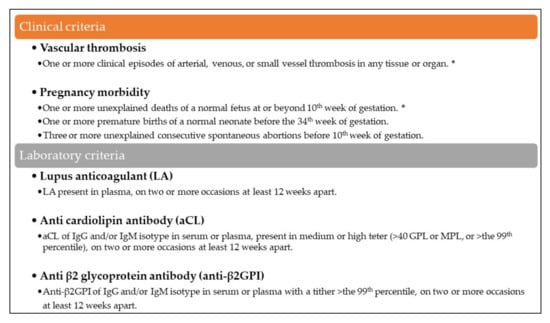 - Miyakis, S.; Lockshin, M.D.; Atsumi, T.; Branch, D.W.; Brey, R.L.; Cervera, R.; Derksen, R.H.W.M.; De Groot, P.G.; Koike, T.; Meroni, P.L.; et al. International consensus statement on an update of the classification criteria for definite antiphospholipid syndrome (APS). J. Thromb. Haemost. 2006, 4, 295–306. [Google Scholar] [CrossRef] [PubMed]