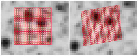 Volume data analysis in a voxel space representation is a logical extension of 2D image data processing. In the field of Photogrammetry and Computer Vision, image correlation techniques are often used for fine measurement of corresponding points in image sequences or stereo image pairs. Early contributions applied cross-correlation to image data [1]. In the early 80’s, gradient based algorithms were developed using an iterative least squares method [2] that also offers subpixel precision. Lucas and Kanade [2] only introduced two translation parameters, whereas Ackermann [3] and Grün [4] extended the model toward an affine and radiometric transformation, which also considers rotation, scaling and shear to obtain a better adaption for perspective distortions. As an example for the least-squares matching (LSM) algorithm, an image section of a textured concrete surface with two views is illustrated in Figure 1. Figure 1a shows a section of the reference image with the patch (subimage) consisting of the pixels included in the computation. The pixels are illustrated as red squares with red circles in the centers. In Figure 1b, an image section of the second view as well as the transformed patch (red squares with red circles) are depicted. In this example, the transformation includes translation, rotation, scale and shear and the corresponding parameters are obtained by the LSM algorithm. The most important parameters are the shifts, which typically show an accuracy of 0.02 to 0.05 pixels in this kind of application.