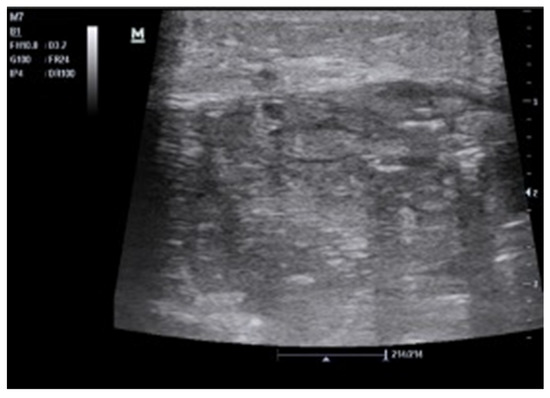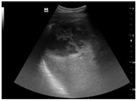The presence of hyperechoic spots within the urinary system is usually referred to calculi, although the presence of gas can mimic renal calculi. In a dilated calico–pelvic system and a distended bladder, the presence of intraluminal mass or material is easily appreciable. US findings include hydronephrosis with echogenic material in the collecting system, with a shifting urine debris. This finding has a 100% positive predictive value for suspected pyonephrosis and can thus ascertain the presence of urosepsis [25,57,58] (Figure 10).