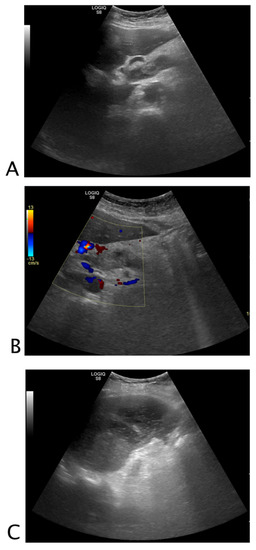 US is the best non-invasive method to evaluate patients with suspected biliary abnormalities [26,45]. Bile duct diseases result in dilatation of the intra- and/or extra-hepatic ducts. The width of the common bile duct in normal individuals does not exceed 6 mm measured at the crossing with the right hepatic artery. In elderly subjects and patients who have undergone cholecystectomy, the common bile duct can measure up to 8 mm in the absence of obstructive pathology. Usually, the intra-hepatic bile ducts are easily seen close to the hilum and do not normally exceed 2 mm. Visualization of dilated intrahepatic bile ducts centrally and peripherally—where they are usually not visible—is due to dilation. To increase diagnostic accuracy, the use of color Doppler can easily help to differentiate between dilated bile ducts and the vascular structure. Acute cholecystitis is caused by gallstones in 95% of cases whereas 5% of cholecystitis cases are acalculous. Although the most common abnormality is choledocholithiasis, the presence of biliary dilatation, even in the absence of direct stone identification, is still an independent predictor of the presence of gallstones [46,47,48]. US is the primary diagnostic tool for acalculous cholecystitis with hydrops, which is defined as distension greater than 8 cm longitudinally or 5 cm transversely. In this case, the black aspect of the gallbladder is much wider than it would normally be. Other US signs include a 3.5–4 mm (or more) thick wall (if the gallbladder is distended to at least 5 cm longitudinally, and the patient has no ascites or hypoalbuminemia), pericholecystic fluid, and/or sub-serosal edema [49].