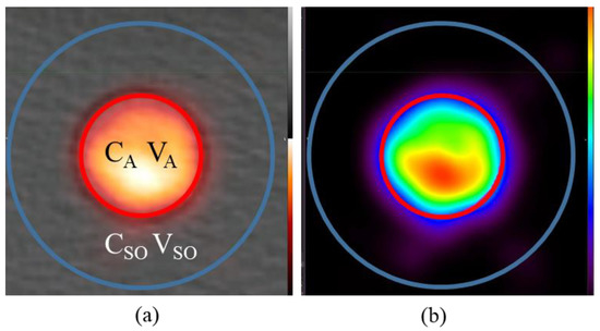 Visualization of PET PVE in the presented phantom, specifically the “spill-out” effect from the hot to cold region. (a) The true artery ROI (outlined in red) as contoured in CT is listed as having image-derived concentration CA and volume VA while the large region (labelled CSO/VSO, outlined in blue) is comprised of the true hot region plus the “spill-out” region. (b) Visualization of the “spill-out” from the VA region into VSO shown on the PET only.