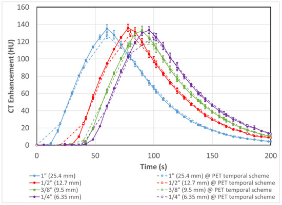 Solid lines are input function shape and intensity of the 4 tubes of decreasing internal diameter as assessed with DCE-CT. As the contrast passes through tubes of decreasing size the velocity of the fluid increases but the flow rate remains constant which produces a set of 4 reference curves with equal intensity, shape and AUC. Dashed lines are curves with averaging done over 20 s on the corresponding solid lines at the same sampling time points as the dPET scan (described in Section 3.2). Error bars represent the experimental range of replicate results (n = 2).