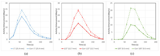 Mean input function activity can be successfully corrected for flow tubes (a) 1” (25.4 mm), (b) ½” (12.7 mm) and (c) 3/8” (9.5 mm) in a situation with no background. All three tubes are corrected to varying degrees with smaller tubes having larger corrections (42 ± 4% for 3/8”) than the large ones (21 ± 3% for 1”) in terms of AUC Error bars represent the standard error from multiple ROI regions (n = 5).
