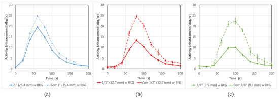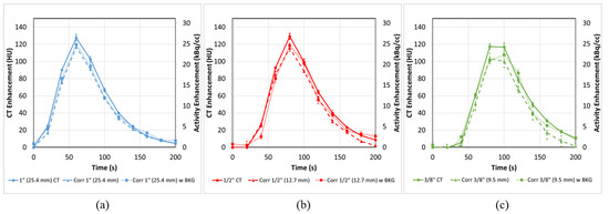 In this case, Equation (2) must be applied to correct the input functions to more representative values, due to the presence of background. As in Figure 6, these corrected curves (Figure 7 dashed lines) are brought roughly in line with each other as the AUCs are recovered by 21 ± 4%, 38 ± 9% and 49 ± 15% for the 1”, 1/2” and 3/8” tubes, respectively.