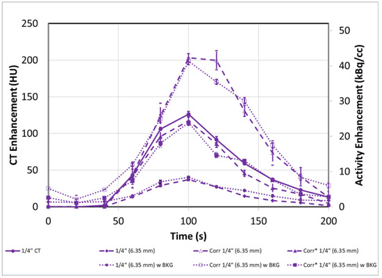 The overcorrection (open symbols) of the original input functions (filled circles) due to proximity of the venous tube when using Equation (2) (diamond symbols) can be corrected (Cor*) using Equation (6) (closed symbols) in both cases with and without background. PET-CT error bars represent the standard error from multiple ROI regions (n = 5). CT error bars represent the experimental range of replicate experiments (n = 2).