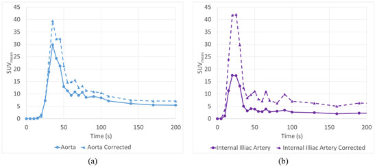 A number of correction strategies have attempted to address PVE of AIF in dPET. The most common approach applies the use of recovery coefficients, which is a typical approach applied in static PET scans. This approach involves performing a relative correction, using a constant for a region based on its true size [1,5,23,24,25,26,27]. These approaches are primarily designed for spherical lesions and intended to correct only the SUVmax (a measurement of 1 voxel) of a region of interest, leaving the SUVmean unaccounted for. Unfortunately, the SUVmax is more sensitive to statistical fluctuations, especially in situations with very high PET noise [5,28]. High noise is the norm in dPET, where frame duration can be as low as 10 s, and this often leads to an overestimation of the true value [28]. Another challenge to these approaches corrects only for the “spill-out” from the ROI, while neglecting the “spill-in” from other regions into the ROI, from either the background or another high-activity region (veins, bladder, etc.).