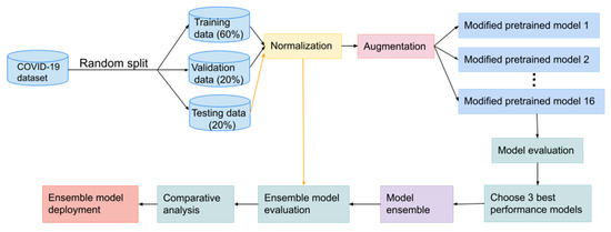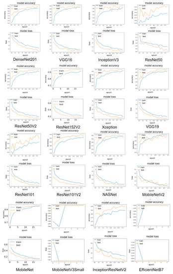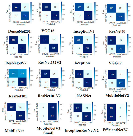 Sixteen widely used CNN models are chosen to perform transfer learning for the COVID-19 recognition task: VGG16, InceptionV3, ResNet50, ResNet152V2, ResNet101, ResNet101V2, DenseNet201, MobileNetV3 small, MobileNet, MobileNetV2, VGG19, ResNet50V2, XceptionNet, InceptionResNetV2, NASNet, and EfficientNet. The reason for selecting these models is that they are effective in computer vision. Many of them have been reported to function well in medical diagnostics [36,37].