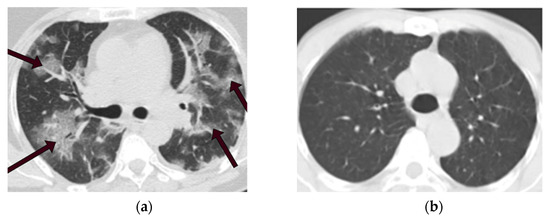 CT scans of COVID-19 and non-COVID-19 patients. (a) CT scan of a COVID-19 patient. (b) CT scan of a non-COVID-19 (not normal) patient.