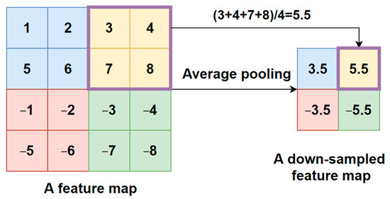 - An average pooling layer, which produces a down-sampled feature map by averaging the values of all pixels in each batch of the feature map, and the calculating procedure is shown in Figure 4. The output size of the pooling layer is calculated as follows:where represents the input size of the pooling operation. is the size of the pooling filter. is the stride size;