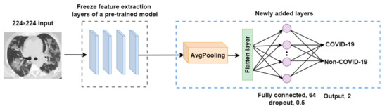 These newly added layers within the modified models are trained using the COVID-19 dataset. After each training epoch, the models are validated against a validation set. Since this research examines a binary classification problem (COVID-19 and non-COVID-19 classes), the number of neurons at the output layer was, thus, set to two. Figure 5 shows the modified architecture of the sixteen pre-trained models used in this research.