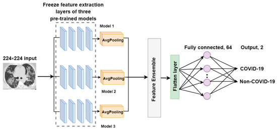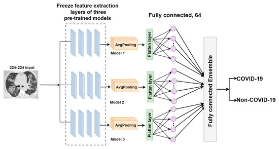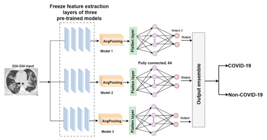 The output-ensemble deep neural network for COVID-19 (O-EDNC) approach is accomplished by assemble three pre-trained models at the output layer with 14 trainable parameters. This method can be represented as follows: