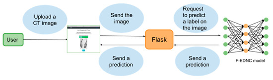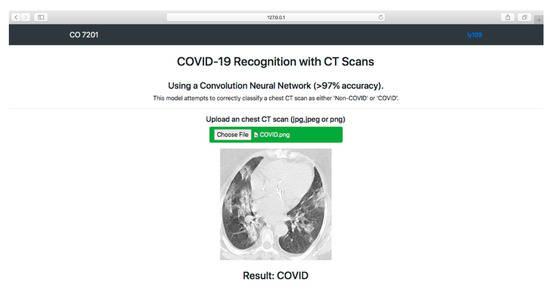 As shown in Figure 16, a simple HTML web page was created to allow users to obtain COVID-19 results. Users can upload CT scan images by clicking the “Choose File” button. Once the users hit the “Predict!” button, the image will be sent to the system backend, where the proposed model can use the input image to predict the COVID-19 condition. The results (COVID-19 or Non-COVID-19) will be displayed on the front end. (The code is available at https://github.com/rgiol/code, access date: 4 January 2022).