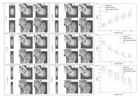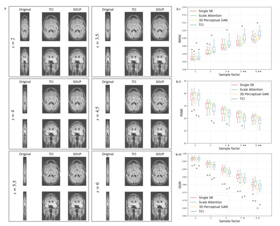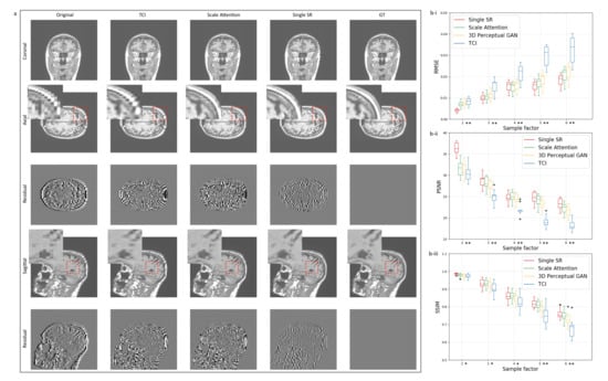 - Wang, J.; Chen, Y.; Wu, Y.; Shi, J.; Gee, J. Enhanced generative adversarial network for 3D brain MRI super-resolution. In Proceedings of the 2020 IEEE Winter Conference on Applications of Computer Vision (WACV), Snowmass Village, CO, USA, 1–5 March 2020; pp. 3616–3625. [Google Scholar] [CrossRef]