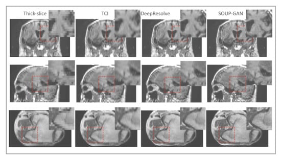 - Greenspan, H.; Peled, S.; Oz, G.; Kiryati, N. MRI Inter-slice Reconstruction Using Super-Resolution. In Proceedings of the Medical Image Computing and Computer-Assisted Intervention—MICCAI 2001, Utrecht, The Netherlands, 14–17 October 2001; Niessen, W.J., Viergever, M.A., Eds.; Springer: Berlin/Heidelberg, Germany, 2001; pp. 1204–1206. [Google Scholar]