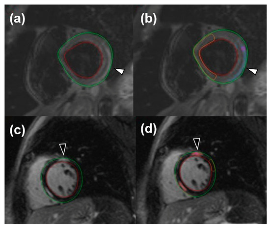 Short-tau inversion recovery images for the visualization of edema (white arrowheads) both without (a) and with (b) an automatic quantification mask of remote myocardium and late gadolinium enhancement (black arrowheads), without (c) and with (d) an automatic quantification mask of remote myocardium.