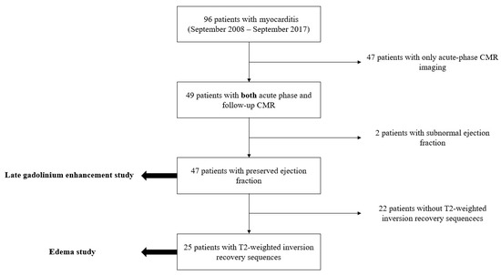 From a total of 96 patients with suspected myocarditis and a CMR examination performed between September 2008 and March 2017 retrieved from our database, 47 were eligible for the LGE study, of which 25 were eligible for the edema study according to the inclusion and exclusion criteria, as shown in Figure 2.