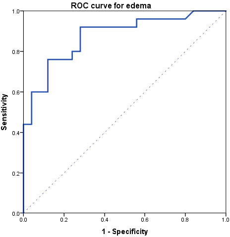 Receiver operating characteristics (ROC) curve obtained comparing edema data between acute-phase and controls.