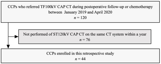 This retrospective study was approved by the local institutional review board (M2020-071), which waived the requirement for informed consent. We identified the 120 CCPs who were referred for TF100kV CAP CT during postoperative follow-up or chemotherapy from our radiologic databases between January 2019 and April 2020. The patient selection process of the study is shown in Figure 1. The inclusion criteria were imaging the standard 120 kV (ST120kV) CAP CT on the same CT system within one year of undergoing TF100kV CAP CT. There were no exclusion criteria. Thus, a total of 44 CCPs were included in our study. Patient clinicopathological data were extracted from electronic medical records. The tumor-node-metastasis staging system was used according to the edition valid at the time of cancer diagnosis. A radiologist determined the presence of metastases in each patient at different time points, both the TF100kV and ST120kV protocol scans, respectively, based on clinicopathological data as of April 2021 from electronic medical records. The metastases evaluated were as follows: (1) lung metastasis, (2) liver metastasis, (3) lymph node metastasis, (4) peritoneal dissemination, and (5) bone metastasis. The diagnostic criteria for metastasis were based on the pathological diagnosis if the biopsy was performed, or if not, clinical diagnosis using radiology reports and clinical records. We defined disease-free as patients with no evidence of new lesions on the CT images, and the tumor markers were below cut-off levels. For patients during chemotherapy, we determined that the negative of metastasis was if the target lesions completely disappeared on the CT images.