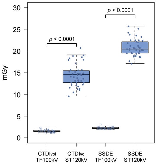 Radiation metrics are summarized in Table 3. The mean CTDIvol was 1.60 ± 0.31 mGy for the TF100kV protocol and 14.4 ± 2.50 mGy for the ST120kV protocol, which differed significantly (p < 0.0001; Figure 2). Mean DLP of the TF100kV protocol was significantly lower than that of the ST120kV protocol (107.1 (95.9–125.5) mGy cm vs. 996.7 (886.2–1144.3) mGy cm, p < 0.0001). The mean effective dose was 1.93 (1.73–2.26) mSv for the TF100kV protocol and 17.9 (16.0–20.6) mSv for the ST120kV protocol (p < 0.0001), which corresponded to an 89.2% lower dose using the TF100kV protocol compared with the ST120kV protocol. The effective dose calculated for the TF100kV protocol was close to 2 mSv. In addition, the TF100kV protocol had a significantly lower mean SSDE than the ST120kV protocol (2.29 ± 0.24 mGy vs. 20.8 ± 1.90 mGy, p < 0.0001; Figure 2).