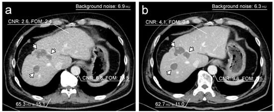 Representative single-phase enhanced CT images. Both images were acquired on separate occasions from a 62-year-old male who had liver metastases after colon cancer surgery. The tin-filtered 100 kV (TF100kV) protocol (a) shows lower CNR and higher FOM than the standard 120 kV (ST120kV) protocol (b). Liver metastases are detectable in both protocols (arrows).