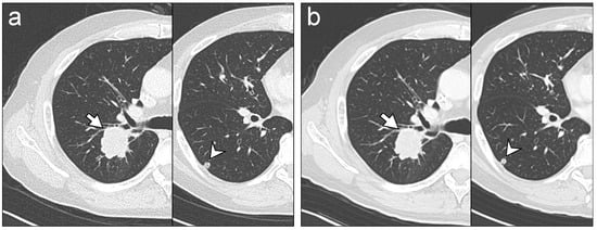 Representative chest CT images. Images were acquired on separate occasions from a 66-year-old male who received chemotherapy for lung metastases after colon cancer surgery. The readers identified lung metastasis lesions (arrows and arrowheads) on tin-filtered 100 kV (TF100kV) images (a) and standard 120 kV (ST120kV) images (b) with equal reliability, regardless.
