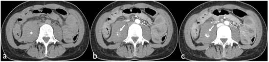 - Tani, R.; Sofue, K.; Sugimoto, K.; Katayama, N.; Hamada, M.A.; Maruyama, K.; Murakami, T. The utility of transarterial embolization and computed tomography for life-threatening spontaneous retroperitoneal haemorrhage. Jpn. J. Radiol. 2019, 37, 328–335. [Google Scholar] [CrossRef]