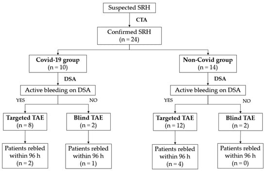 In our experience, CTA revealed signs of active bleeding in 20 patients (83%), specifically, 90% (9/10) of COVID-19 patients and 79% (11/14) of non-COVID-19 patients, with no statistically significant difference between the two groups. Our results are in line with the rates reported in the literature, ranging from 78.9–93.3% [21,24,32].