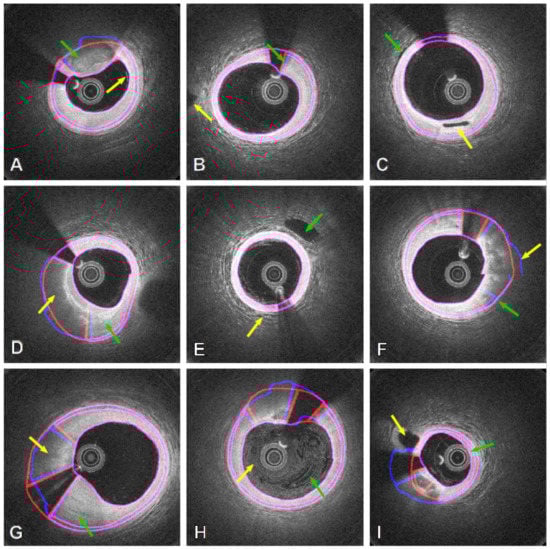 - Ughi, G.J.; Adriaenssens, T.; Onsea, K.; Kayaert, P.; Dubois, C.; Sinnaeve, P.; Coosemans, M.; Desmet, W.; D’hooge, J. Automatic segmentation of in-vivo intra-coronary optical coherence tomography images to assess stent strut apposition and coverage. Int. J. Cardiovasc. Imaging 2012, 28, 229–241. [Google Scholar] [CrossRef] [PubMed]