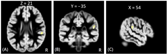Figure 1. The VBM analysis of GM volume between the NV and HC groups. The yellow-white color indicates the significantly increased GM volumes in the NV group HC in the right superior temporal gyrus. The images are shown in axial (A), coronal (B), and sagittal views (C).