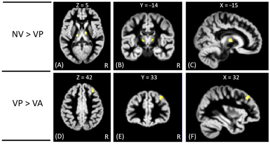Figure 2. The VBM analysis of GM volume between the VP, VA, and NV groups. The yellow-white color indicates the significantly different GM volumes between VP and NV in the bilateral thalamus (AC), and between VA and VP in the right middle frontal gyrus (DF). The images are shown in axial (A,D), coronal (B,E), and sagittal views (C,F).