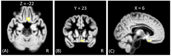 Figure 3. The voxel-wise DTI analysis of AD values between VP and HC groups. The yellow-white color indicates significantly increased AD values in the VP group in the right rectus gyrus. The images are shown in axial (A), coronal (B), and sagittal views (C).