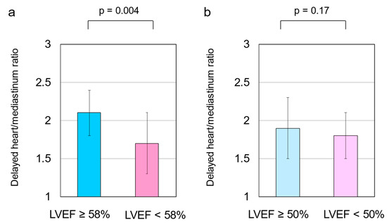 (a) The delayed heart/mediastinum (H/M) ratio was significantly higher in patients with a left ventricular ejection fraction (LVEF) of ≥58% than in those with an LVEF of <58% (2.1 ± 0.3 vs. 1.7 ± 0.4, p = 0.004). (b) When divided into two groups using an LVEF of 50%, no significant differences were found in the delayed H/M ratio between the two groups (1.9 ± 0.4 vs. 1.8 ± 0.3, p = 0.17). These data were compared using an unpaired Student’s t-test.