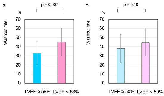 (a) The washout rate (WR) was significantly lower in patients with a left ventricular ejection fraction (LVEF) of <58% compared to that of those with an LVEF of ≥58% (32.9 ± 12.6% vs. 45.1 ± 15.4%, p = 0.007). (b) No significant differences were found in the WR between patients with an LVEF of ≥50% and those with an LVEF of <50% (37.8 ± 15.7% vs. 44.6 ± 15.2%, p = 0.10). These data were compared using an unpaired Student’s t-test.