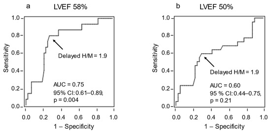 The ability of the delayed heart/mediastinum (H/M) ratio to identify LVEF of 58% or 50% was evaluated using a receiver operating characteristic (ROC) curve analysis, in which the area under the curve (AUC) and 95% confidence interval (CI) were calculated. (a) The ROC curve for the delayed H/M ratio for predicting a left ventricular ejection fraction (LVEF) of 58% was 0.75 (95% CI 0.61–0.89, p = 0.004). From this analysis, a delayed H/M ratio of 1.9 had a sensitivity and specificity of 80.0% and 72.9%, respectively, for predicting an LVEF of 58%. (b) The area under the ROC curve for delayed H/M ratio for predicting an LVEF of 50% was not significant (0.60; 95% CI 0.44–0.75, p = 0.21).