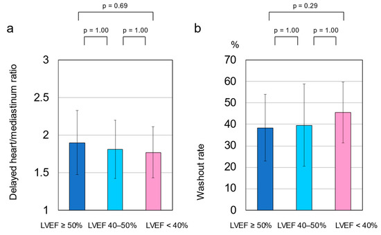 Comparison of the delayed heart/mediastinum ratio (H/M) and the washout rate (WR) among the three groups; LVEF ≥ 50% (n = 22), LVEF 40–50% (n = 9), and LVEF < 40% (n = 32). No significant differences were observed in the delayed H/M ratio (1.9 ± 0.4 vs. 1.8 ± 0.4 vs. 1.8 ± 0.3, respectively, p = 0.48 (a) or WR (37.8 ± 15.7% vs. 39.7 ± 19.2%, vs. 45.5 ± 14.3%, respectively, p = 0.22 (b) among the three groups. These data were compared using an analysis of variance (ANOVA) with Bonferroni adjustment.