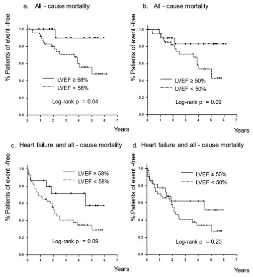 During the follow-up period (median, 3.0 years; mean, 3.3 ± 1.8 years), 28 unscheduled hospitalizations owing to HF and 18 all-cause deaths were observed (Table 5). The causes of death were HF (n = 8), malignant neoplasm (n = 3), senility (n = 2), trauma (n = 2), sudden death (n = 2), and infection (n = 1). In the LVEF of ≥58% group, one death out of 15 patients (6.7%) was observed, compared to 15 out of 41 patients (36.6%) in the LVEF of <58% group. Out of the 10 cases of cardiac death, nine cases were in the LVEF < 50% group. The only deceased patient with an LVEF of ≥58% died of senility. The combined endpoints of HF readmission and all-cause mortality occurred in 35 out of 63 patients (55.6%). In the LVEF of ≥58% group, five out of 15 patients (33.3%) were hospitalized for HF, and in the LVEF of <50%, nineteen of 41 patients (46.3%) were hospitalized for HF. Among the seven patients with an LVEF of 50% to 58%, two deaths (one from senility and one from HF) and four HF hospitalizations were observed. The Kaplan–Meier plot showed that the incidence of all-cause mortality was significantly lower in patients with an LVEF of ≥58% than in those with an LVEF of <58% (log-rank, p = 0.04; Figure 5a). In contrast, all-cause mortality did not differ between patients with an LVEF of ≥50% and those with an LVEF of <50% (log-rank, p = 0.09; Figure 5b). Figure 5 shows the Kaplan–Meier curve for the composite of all-cause mortality and HF readmission with a cutoff of 58% LVEF (log-rank, p = 0.09; Figure 5c) and 50% LVEF (log-rank, p = 0.20; Figure 5d). Regarding the composite of all-cause mortality and HF readmission, no significant difference in event-free rate was observed when patients were divided into the two groups, both with an LVEF cutoff of 58% and 50%.