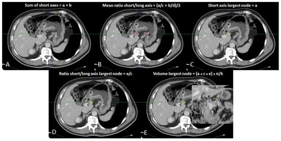 Loco-regional CT measurements: (A) sum of short axes; (B) mean of ratios of short/long axes; (C) short axis of largest lymph node; (D) ratio of short/long axis of largest lymph node; (E) volume of largest lymph node.
