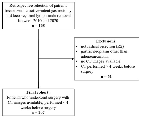 This was a retrospective observational study, approved by the local ethics committee (number of protocol 0050680 approved on 10 August 2021). All consecutive patients who underwent curative-intent surgery for GC between 2010 and 2020 were extracted from the prospectively maintained database of our tertiary-level University Hospital. Patients who underwent palliative or non-radical (R2) surgery, those with gastric neoplasms other than adenocarcinoma (e.g., benign, carcinoids, gastrointestinal stromal tumors, etc.), and those with no CT scan available or obtained more than 4 weeks before their surgical procedure were excluded. Demographic and clinicopathological data, and tumor- and therapy-related variables were extracted, including type of surgery, extent of lymphadenectomy (D1 vs. D2), and perioperative treatment (chemotherapy or chemoradiotherapy). Lymphadenectomy was classified as D1 or D2 according to the Japanese Gastric Cancer Association (JGCA) guidelines, 5th edition [24]. Data on postoperative outcome, such as length of hospital stay (LOS), and type of complication according to the Clavien-Dindo classification [25], were included. For each surgical specimen, a dedicated gastrointestinal pathologist reported: site of lesion, tumor size, histological type, grade, total number of LNs harvested, number and sites of metastatic LNs, and stage of disease according to the American Joint Committee on Cancer (AJCC) staging system, 8th edition [26]. LN status was recorded systematically, considering the presence or absence of metastatic nodes for each nodal station, the total number of nodes retrieved in the specimen, the total number of metastatic nodes, and the number of metastatic LNs out of the total number of LNs harvested, or LN ratio (LNR). Pathological margin status was classified as microscopically negative (R0) or positive (R1). All patients underwent a standard oncological follow-up, according to Italian guidelines [27].