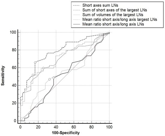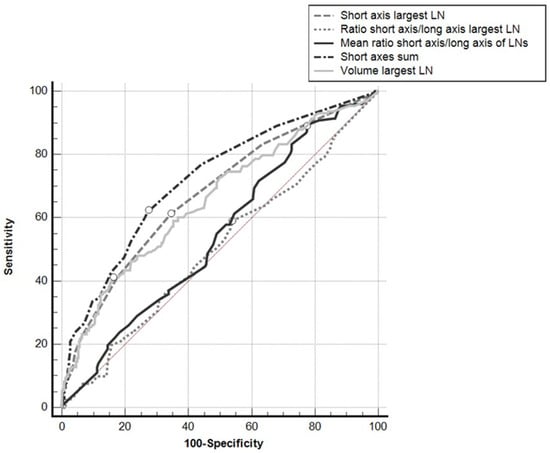 The AUC of all the ROC curves differed significantly from the identity line (p < 0.001), except for the mean of the SA/LA ratios of the largest LNs in the nodal groups (p = 0.4932), and the mean of the SA/LA ratios of all the LNs in all the nodal groups (p = 0.890). Using Youden’s index, a >39 mm cutoff for the sum of the SAs of the LNs in all the nodal groups showed a sensitivity of 65.6% and a specificity of 83.7%; a >28 mm cutoff for the sum of the SAs of the largest LNs in all the nodal groups showed a sensitivity of 59.4% and a specificity of 74.4%; for the sum of the volumes of the largest LNs in all the nodal groups, a cutoff of >1498 mm3 achieved a sensitivity of 51.6% and a specificity of 86.0%.