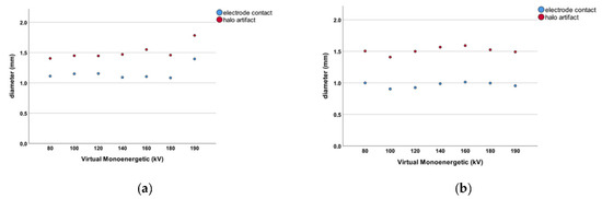(a) Dot chart for the PCD-CT measurements. The blue dots represent the diameter of the individual electrode contacts for each VME setting. The red dots represent the diameter of the respective halo artifact for that VME increment. (b) Dot chart for the EID-CT measurements. The blue dots represent the diameter of the individual electrode contacts for each VME setting. The red dots represent the diameter of the respective halo artifact for that VME increment.