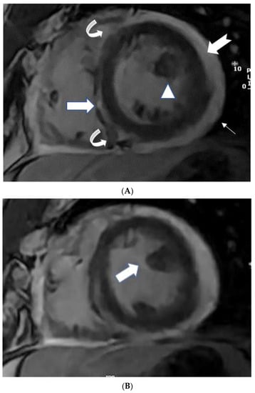 Enlargement of the papillary muscles has not been described before in tuberculous myopericarditis (Figure 2B). Hypertrophy or infiltrative illnesses (e.g., amyloidosis, sarcoidosis, iron deposition) may thicken papillary muscles, affecting papillary muscles [44]. Although coronary atherosclerosis is the most common cause of LGE of the papillary muscle without rupture, this disorder can also be caused by shock, infectious endocarditis, acute valvular regurgitation, anemia, LVOT blockage, systemic hypertension, cardiomyopathies, endocardial fibroelastosis, endomyocardial fibrosis, and myocardial diseases [44,46].