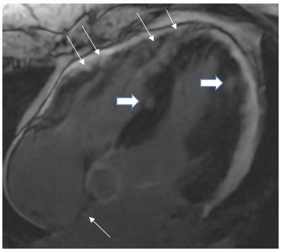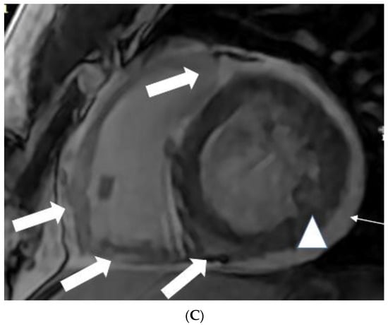 Detecting inflammatory pericarditis has become easier with the development of new CMR techniques [32,33]. T1-weighted spin-echo CMR or cine CMR can detect pericardial layer thickness and simultaneous pericardial effusion, whereas T2-weighted STIR spin-echo CMR can detect pericardial layer edema. Pericardial enhancement in gadolinium-enhanced CMR investigations is an appropriate approach for detecting pericardial inflammation (Figure 1, Figure 2 and Figure 3). Both LGE CMR and spin-echo CMR are advantageous. A fat-suppressive prepulse could enhance the visibility of pericardial inflammation [32]. Delineation of the pericardial layer, which may become more irregular in chronic pericarditis, and streaky enhancement of the surrounding fat and adjacent myocardial tissue, indicate concomitant epicarditis or myocarditis and are additional intriguing imaging characteristics [32]. Yelgec and colleagues recently discovered pericardial enhancement in 9 persons and pericardial effusion in 6 of 20 patients tested with CMR for clinical suspicion of acute myocarditis, confirming the prevalence of myopericarditis [34]. Furthermore, Sayed et al. observed that 53.1% of patients with tuberculous pericarditis with pericardial enhancement developed myopericarditis, as evidenced by reduced left ventricular systolic function or higher circulating myocardial enzymes, in their first prospective investigation on cardiovascular TB [2]. Hence, both results demonstrated that myocarditis and pericarditis may be produced by the same etiologic factor and coexist in the same patient.