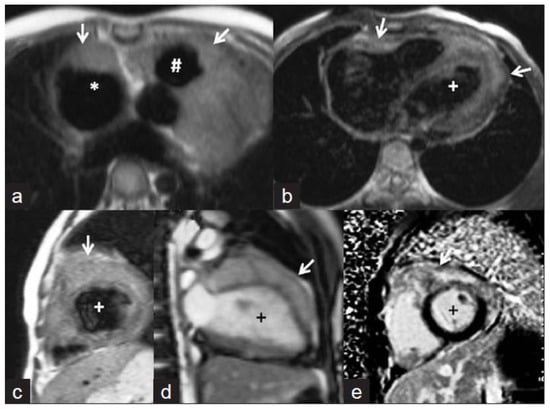 Cardiac magnetic resonance images. (a,b) Axial T1-weighted images showing isointense masses (arrows) along the anterior right atrium (*), right ventricular outflow tract (#), and along both ventricles (+ indicates left ventricle). (c) Short axis T2-weighted image showing that the lesions are mildly hyperintense. (d) Steady-state free precession image revealing the infiltrative nature of the lesion along the left ventricle. The delayed enhanced short-axis image (e) shows heterogeneous enhancement of the mass. The image was adapted from [47].